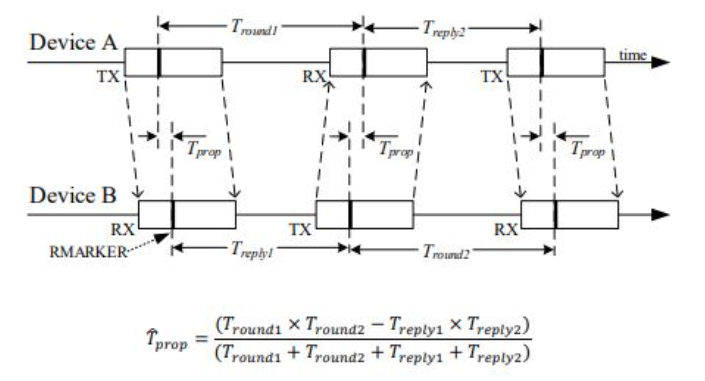 DWM1000을 이용한 거리측정 방법은 타임스탬프를 포함하는 통신 패킷을 다른 모듈로 전송하고 응답되는 시간을 측정하여 시각차이를 측정하여 거리를 계산하는 방식이다.