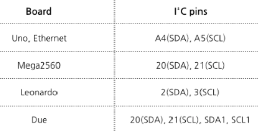 아두이노 기종들 중 나노 이외의 다른 기종의 I2C 통신용 핀은 다음과 같으므로 해당 핀에 연결해 주면 된다.