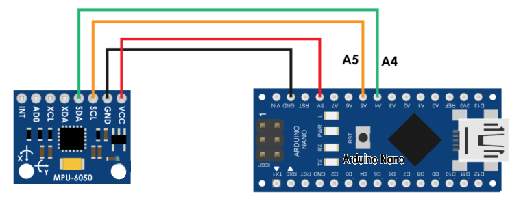 MPU6050의 핀배열은 위와 같고 외부기기와의 접속은 I2C방식 이다. 즉 아두이노 나노일 경우 I2C 통신용 핀이 A4,A5이므로 다음과 같이 연결해 주면 된다.
