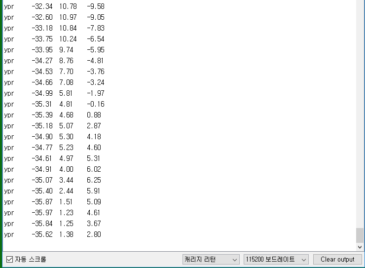 센서모듈을 움직여 보면 다음과 같이 변화되어 측정되는 것을 시리얼모니터로 확인해 볼 수 있다.