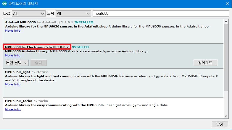 스케치->라이브러리 설치하기 -> 라이브러리관리를 선택해서 라이브러리 매니저화면을 호출한 후 MPU6050를 입력해서 검색하면 여러가지 MPU6050관련 라이브러리들이 나오는데 그 중 두번째 것을 선택하여 설치하면 된다.