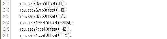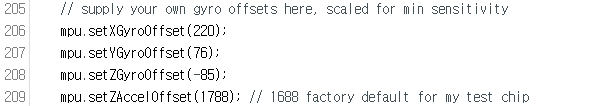 센서에서 측정되는 값은 x,y,z축 가속도와 자이로 센서값이지만 위와 같이 Yaw,Pitch,Roll값으로 변환하여 볼 수 있다. 만약 다른 형태로 측정값을 변환하여 보고 싶다면 샘플 프로그램 87 ~ 120 번째 Line사이의 주석처리를 조정하면 된다. 즉 샘플프로그램 초기 상태는 103번째줄 #define OUTPUT_READABLE_YAWPITCHROLL 이 선택되어 있는데 가속도값을 직접 보고 싶다면 이 103번째줄을 //로 주석처리하고 116번째 줄 //#define OUTPUT_READABLE_WORLDACCEL 문장의 //부분을 지워 선택하면 된다.