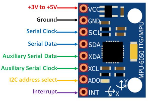 MPU6050 6축센서는 물체의 자세와 움직임을 계측하기 위한 센서로서 X,Y,Z 세방향 가속도측정을 위한 3축 가속도센서와 X,Y,Z 세방향 3축 자이로센서 그리고 온도센서 총 7개의 센서로 구성된 센서이다. 자세와 회전을 측정하기 위한 센서에 온도센서가 포함되어 있는 것은 센서의 측정값이 온도에 영항을 받기 떄문에 이를 보정하기 위한 용도인데 일반적인 온도에서는 편차가 거의 없기 때문에 통상 온도값은 사용하지 않는다. 비슷한 용도의 9축센서도 있는데 이것은 6축센서에 지자기센서(나침반과 같은 지구자기센서) 3축을 더한 센서이다. 이 MPU6050센서칩을 기반으로 보드형태로 모듈화 해 놓은 것이 GY-521 모듈이다.