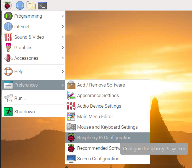 기타의 설정작업은 라즈베리파이 메뉴의 Preference -> Raspberry Pi COnfiguration 메뉴에서 할 수 있다.