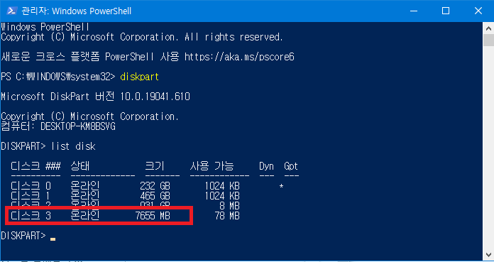 list disk 명령어를 립력하면 PC에 장착된 디스크들의 목록이 표시되는데 이중 SD 카드 용량에 해당하는 디스크의 순번을 확인한다. 여기에서는 8GB 용량의 SD 카드를 장착했기 때문에 3번이 된다.