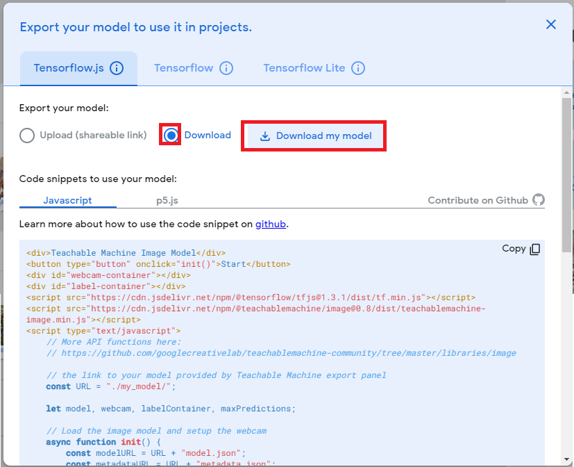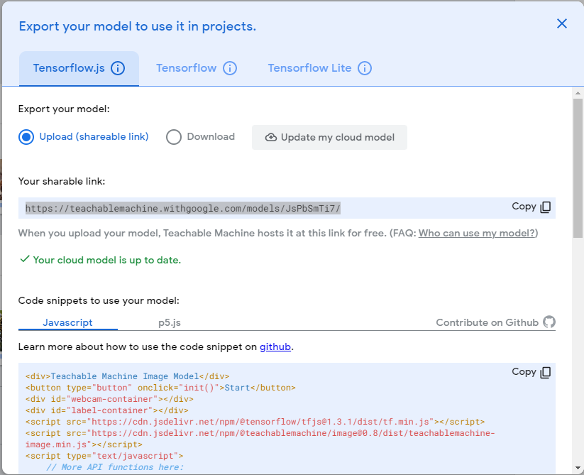 그리고 원하는 웹 페이지를 Teachable Machine에서 제공하는 다음의 sample code를 참조하여 제작하면 되는데,
