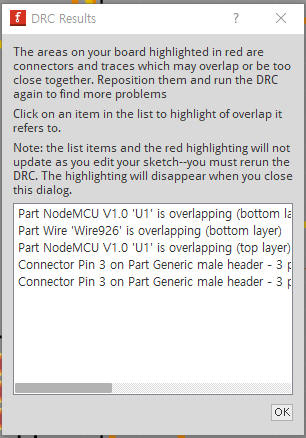 매뉴에서 Routing -> Design Rule Check 기능을 실행시키면 다음과 같이 문제가 있는 사항이 표시된다. 대부분은 부품과 또는 구리선 배열간의 간격이 좁거나 중첩되어 PCB제작에 부적합하다는 내용이므로 해당되는 부분의 배선의 위치나 모양 등을 세부조정하고 다시 CHeck해 본다.