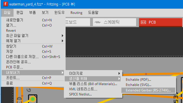 PCB보드의 설계가 완료되면 생산을 위해 제작업체에 생산을 의뢰하기 위해서는 PCB제작도면을 보내주어야 하는데 이 도면의 형식이 Garber파일이다. 다음과 같이 메뉴에서 내보내기 -> 생산을 위해 -> Extended Garber 를 선택하고 저장될 폴더를 지정하면 PCB설계도면 파일들이 여러개 생성된다.