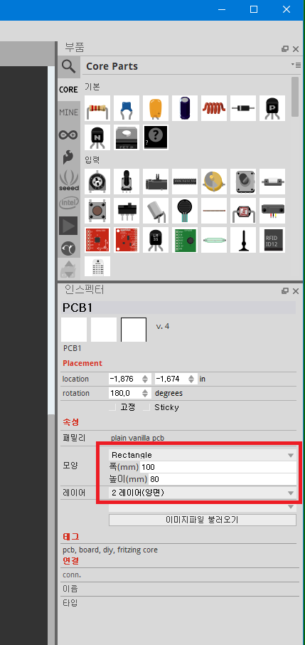 PCB 탭을 선택하면 표시되는 PCB설계 화면에서 속성화면을 보면 다음과 같이 모양과 크기를 설정하는 부분이 있는데 여기에 원하는 PCB보드의 크기를 먼저 지정하고 레이어 종류를 선택한다. 레이어는 PCB보드의 표면에 구리판 회로를 인쇄할 때 한쪽면에만 할 것인지 양면에 둘다 할것 인지 선택하는 것인데, 비용 차이는 없으므로 극히 간단한 회로가 아니면 양면 레이아웃을 선택하는 것이 편하다.