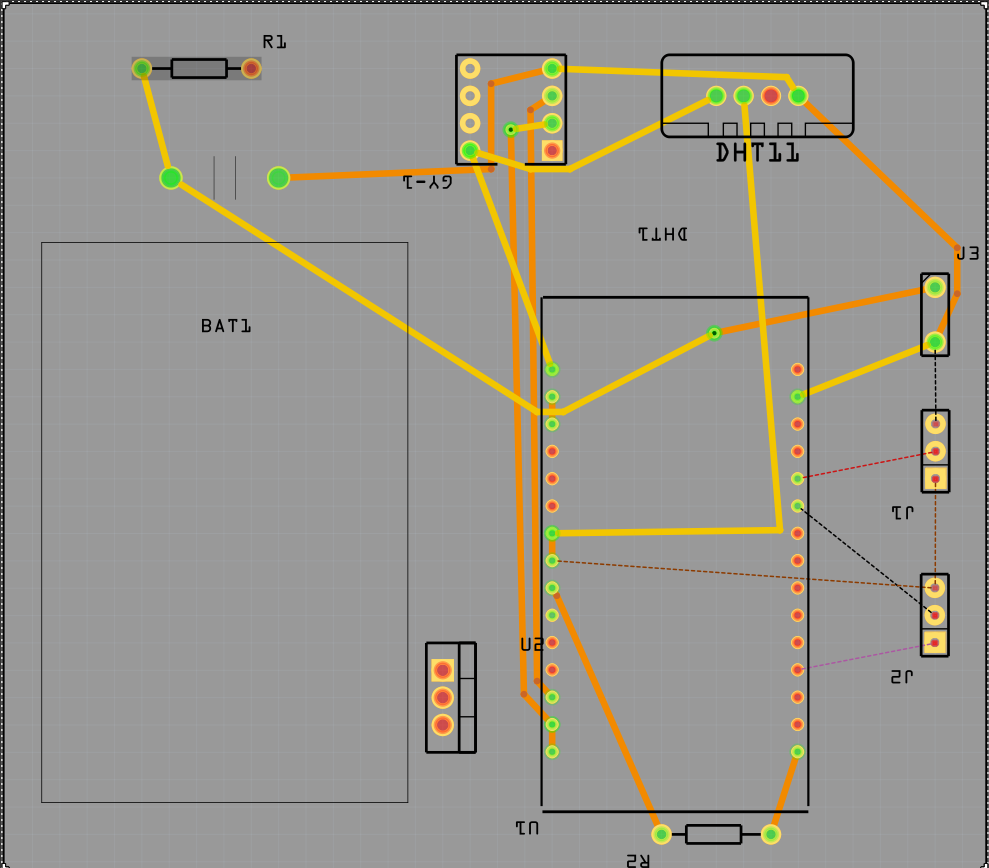 오토 라우칭 작업이 완료되면 다음과 같이 점선의 회로가 구리판 모양으로 변경되어 표시된다. 구리판의 모양이 두종류 인것은 양면 레이아웃 이기 때문에 앞면과 뒷면을 구분하기 위한 것이다. 이 모양을 적당히 재조정하거나 수정하여 변경할 수도 있다.