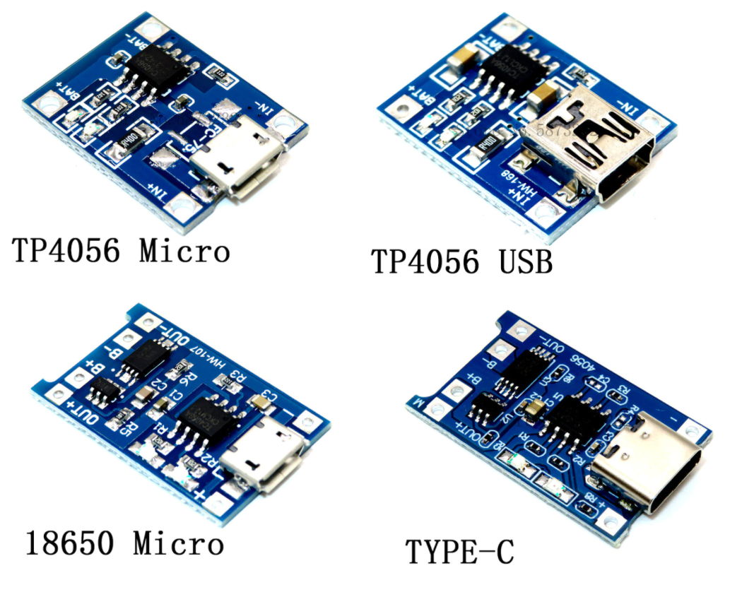 USB 단자의 타입별로 모듈이 판매되고 있으며, 중전 기능 이외에도 방전시 배터리 보호에 필요한 PCM회로가 복합된 모듈로 배터리 연결 단자와 출력단자가 분리되어 있는 모듈도 있는데 큰 가격차이가 없으므로 이 모듈을 사용하는 것이 편하다. 단 이 모듈을 사용할 때 충전하면서 동시에 방전 부하를 걸어 사용하는 것은 좋지 않다고 하므로 이 점 주의 해야 한다.