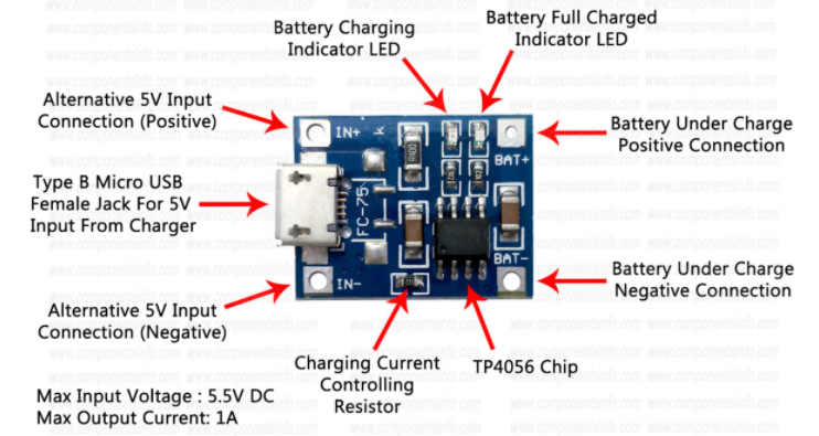 TP4056 모듈은 5V USB 전압을 입력받아 3.7V 리튬이온 배터리를 충전시켜 주는 모듈로서 저렴한 가격에 쓰임새가 많아 자주 사용하는 모듈이다. 즉 18650 등 리튬이온배터리로 회로를 구성했을 경우필요시 이 배터리를 충전시켜 주기 위해 가장 흔하게 사용되는 모듈이다.