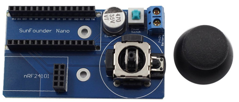 아두이노 나노와 통신모듈을 꽂아 리모트콘트롤러로 사용할 수 있도록 구성된 실드. 콘트롤용 조이스틱까지 내장되어 있으므로 이 보드만으로 필요한 리모콘에 필요한 모든 기능을 구성할 수 있다.