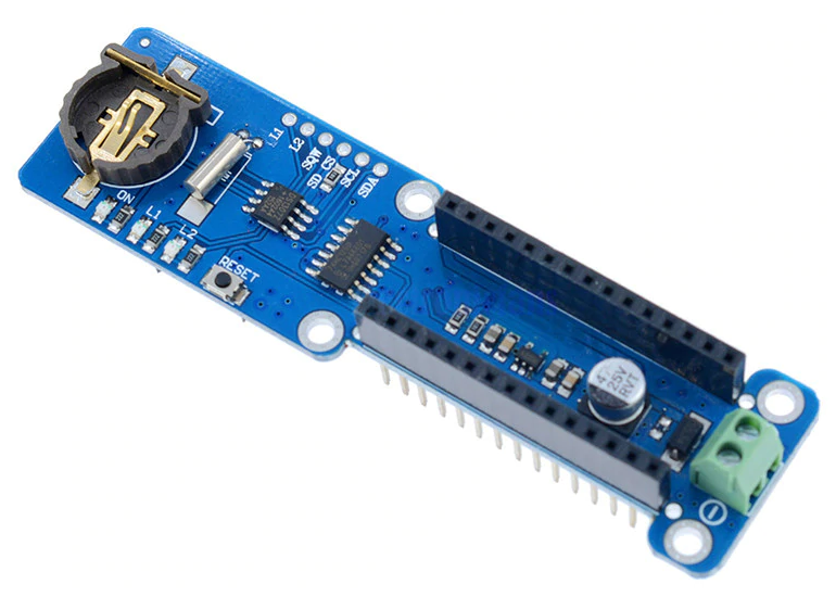 데이터의 보존을 위해 리얼타임클럭과 SD카드를 함께 사용할 수 있는 실드. 아두이노 나노에 연결된 센서들의 측정 값을 보존하고자 할 떄 편리하다. 보드 아래에 SD카드 슬롯이 있고 측정시간을 정확하게 유지하기 위해 리얼타임클럭용 배터리까지 꽂을 수 있다.