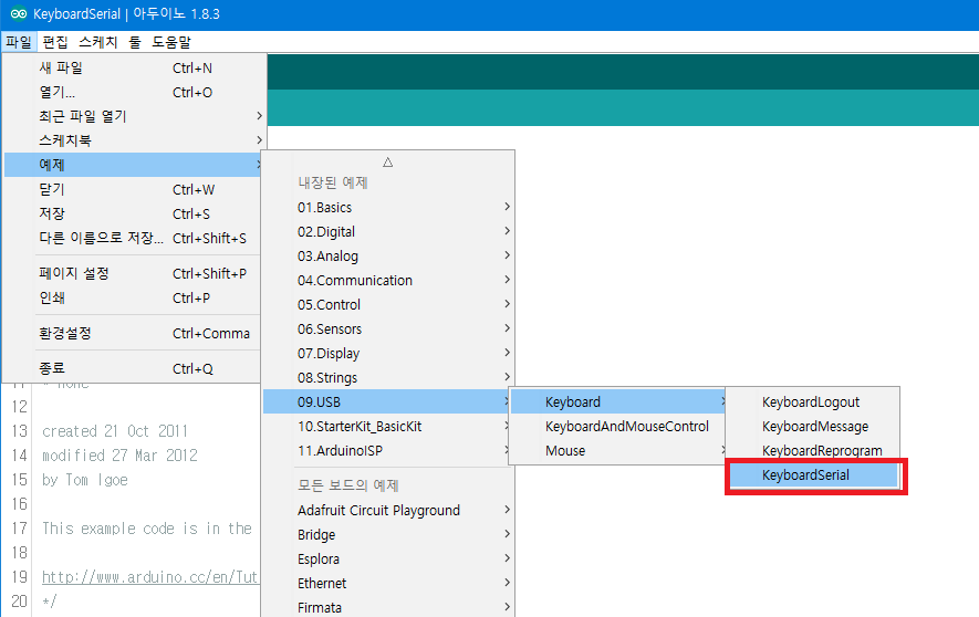 아두이노 프로 마이크로에서 USB 키보드 기능을 제어하는 샘플 프로그램을 Test해 보기 위해서 예제 -> USB -> KeyBoard -> KeyboardSerial 을 선택하여 로드.