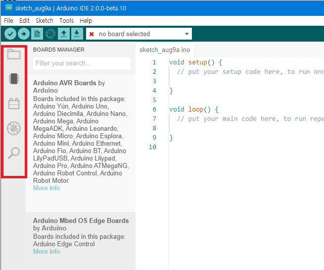 좌측 탭베메뉴는 위에서 부터 파일디렉토리, 보드메니저, 라리브러리메니저, 디버그, 서치 등으로 구성되어 있다.