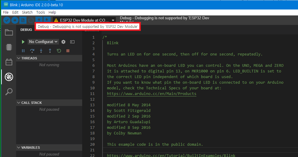 아주이노 IDE에서 제일 부족한 기능인 별도 디버거 없이 Serial monitor 출력해서 디버깅하는 원시적인 상태에서 벗어날 수 있도록 IDE 2.0에서는 디버깅 기능이 별도로 추가 되었다. 그러나 아직 디버그 기능이 활성화되지는 않는다.