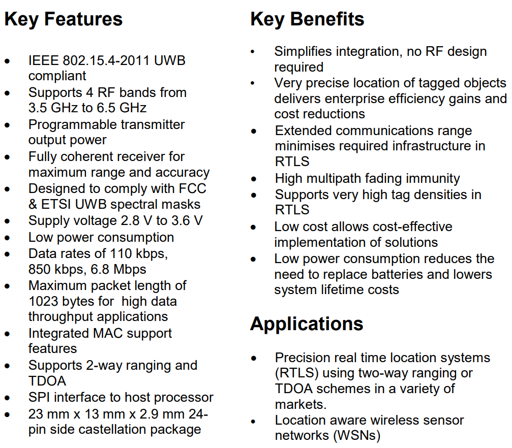 모듈의 주요 스펙과 내세우는 장점은 다음과 같으며 최대 300 미터 범위내에서 수CM 오차 범위로 위치를 추적할 수 있다고 광고하고 있지만 이는 특수 안테나를 사용할 때이고 사용자들의 후기를 보면 모듈에 내장된 안테나만을 이용할 경우 10미터 내외라고 한다.