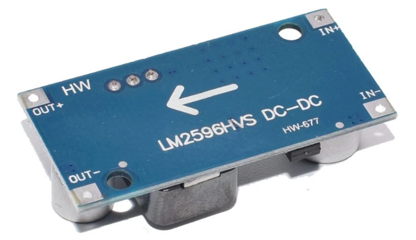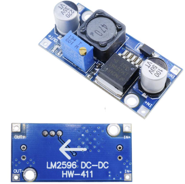 통상 입출력 가능한 전압의 범위로도 구분되지만 주로 사용할 수 있는 전류의 양에 따라 크기와 비용이 정해지는데 아두이노 메이킹 환경에서 가장 흔하게 사용되는 모듈은 다음과 같은 LM2596 StepDown 모듈이다.
