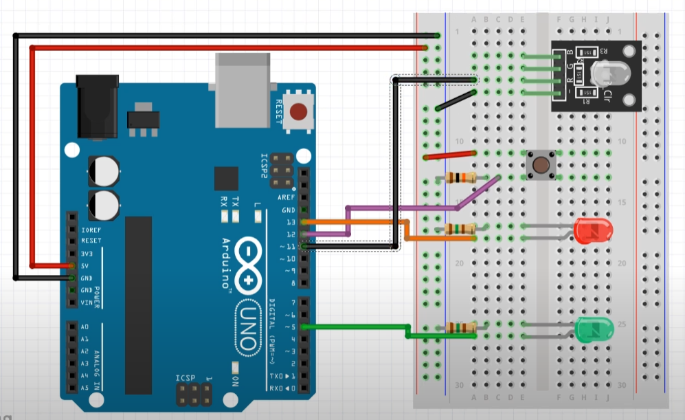 3) 브레드보드 영역에 서 각 부품들끼리 연결을 진행하는 식의 과정으로 회로를 구성한다. 여기에서 브레드보드도 하나의 부품으로서 브레드보드를 통해 케이블을 연결시켜도 되고 브레드보드를 삭제하고 부품간 케이블을 직접 연결해도 된다.