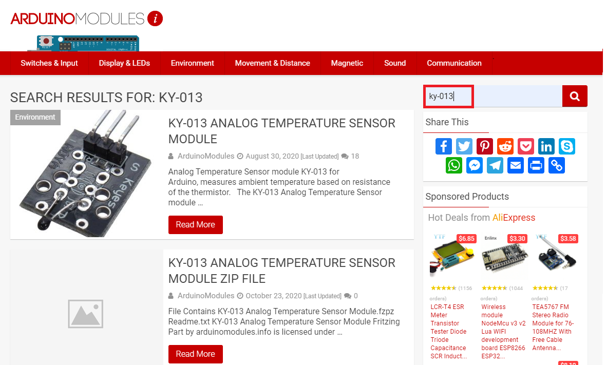 위 사이트에 접속하여 부품명을 검색해보면 아두이노 관련 왠만한 부품들을 검색된다.