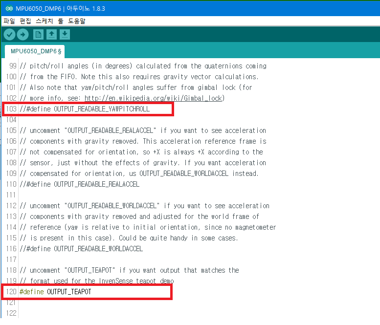 MPU6050_DMP6 예제 프로그램에서 103번째 줄의 #define OUTPUT_READABLE_YAWPITCHROLL 문장 앞에 "//"를 추가해서 주석처리하고 120번째 줄 #define OUTPUT_TEAPOT 문장의 "//"를 제거해 준후 프로그램을 업로드 해 준다.