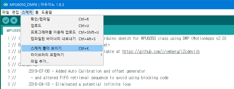 MPU6050_DMP6 이라는 예제프로그램을 호출한 상태에서 아두이노 IDE 메뉴 중 스케치 -> 스케치 폴더 보이기 메뉴를 선택하면 다음과 같이 Processing 용 프로그램폴더를 확인할 수 있다. 이 폴더의 경로를 기록해 둔다.