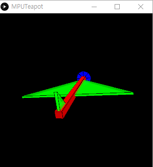 잠시 후 ( 10초 정도 소요됨 ) 화면 하단에 아두이노 측에서 넘어노는 데이터가 표시되면서 다음화면과 같이 비행기 모양의 시뮬레이션이 시작된다. MPU6050 센서를 상하좌우로 움직여 보면 화면상의 비행기도 따라 움직이는 것을 확인할 수 있다.