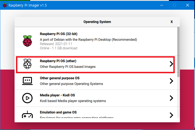 만약 표준형 OS가 아닌 다른 모델을 선택하려면 다음과 같이 두번째 메뉴인 Raspberry PI OS (other)를 선택한다.