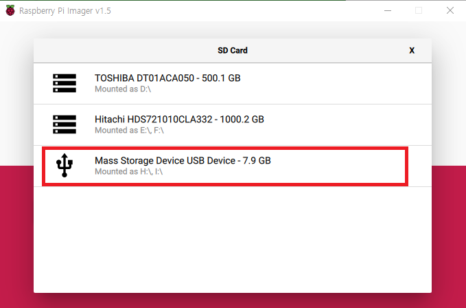 CHOOSE SD CARD 버튼을 클릭하면 다음과 같이 PC에 드라이브 목록이 표시되는데 이 중에서 SD 카드가 장착된 드라이브를 선택한다.