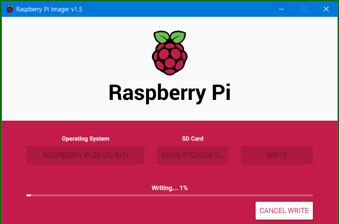 이것으로 설치작업 할 준비는 끝나고 WRITE 버튼을 누르면 OS설치 작업이 개시된다.