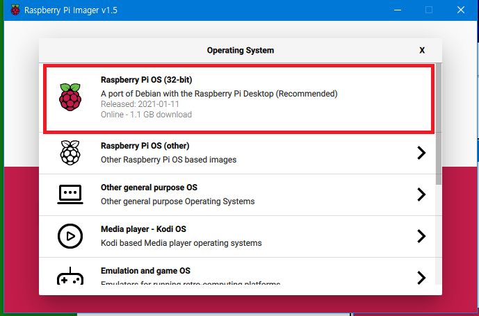 일반적인 표준형으로 설치하려면 최상단의 Raspberry PI OS (32bit) 를 선택하면 아래와 같이 선텍된 OS가 표시된다.