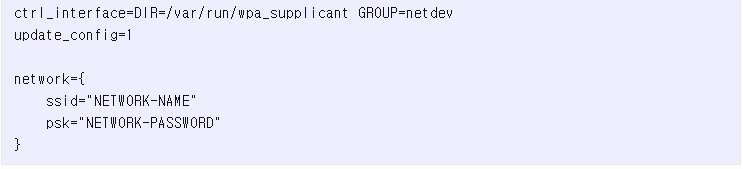 유선 LAN 케이블로 라즈베리파이를 연결한다면 필요 없지만 WIFI 네트워크로 라즈베리파이에 접속할 예정이라면 자동 WIFI접속을 위해 WIFI 설정파일을 생성해주어야 한다. 위와 같은 방법으로 "wpa_supplicant.conf"을 작성하여 다음과 같은 내용을 입력해 준다. 여기에서 NETWORK-NAME 부분에는 접속하고자 하는 무선공유기의 SSID명칭을 지정하고 NETWORK-PASSWORD 부분에는 해당 password를 지정하면 된다.