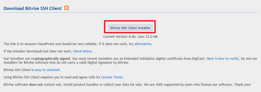 Download Bitvise SSH Client The link is to Amazon CloudFront and should be very reliable. If it does not work, try alternative. If the installer downloads but does not start, check below. Our installers are cryptographically signed. Our most recent inst