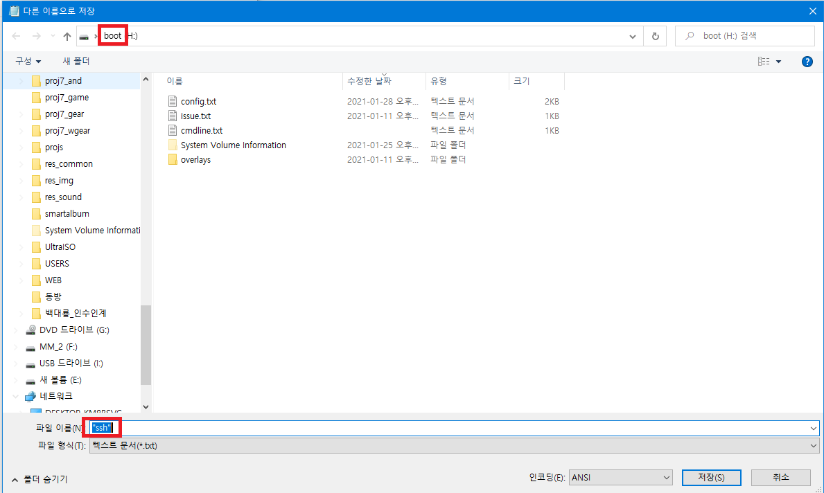 Windows에서 Notepad을 띄워 아무 내용도 입력하지 않은 상태에서 ssh라는 파일명으로 boot 드라이브에 저장하면 된다. 여기에서 주의해야 할 것은 Notepad롤 사용할 경우 저장할 파일명을 지정할 때 "ssh"와 같이 인용부호를 포함시켜야만 .txt라는 확장자 없이 ssh라는 파일명으로 저장된다