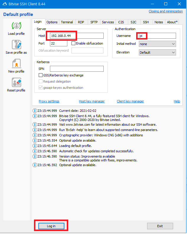 다음과 같이 알아낸 IP주소를 입력하고 username에는 pi를 지정한 후 Login 버튼을 클릭하여 원격접속한다. 초기상태의 패스워드는 raspberry 이다.
