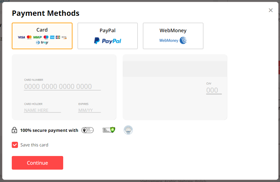 결제는 신용카드나 PayPal로 할 수 있는데 입력한 내용을 Save해 놓으면 다음부터는 새로 입력하지 않고 선택하여 결제할 수 있다.