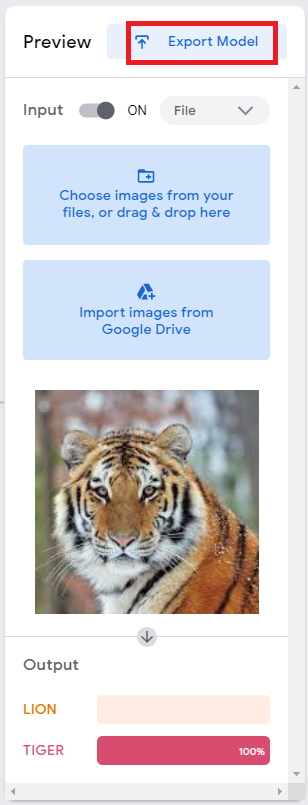 "Export Model"메뉴를 클릭하면 제작된 학습모델을 추출할 수 있는 화면으로 연결된다.