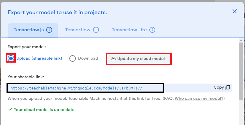 "Upload"를 선택하고 "Upload my cloud model"을 클릭하면 잠시 후에 하단에 Link주소가 표시된다.