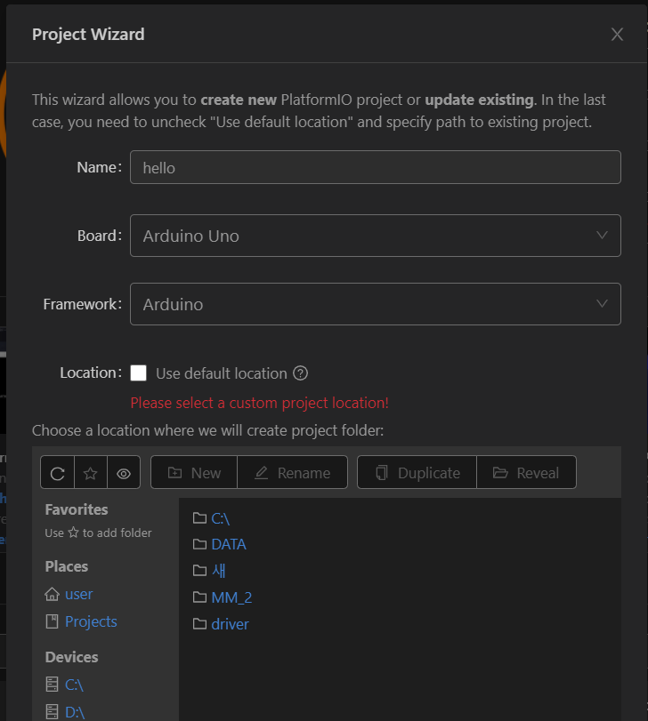 여기에서 새 프로젝트를 시작하려면 New Project를 선택하면되고, 기존의 아두이노 IDE에서 개발했던 내용을 끌어와서 사용하려면 Import Arduino Project를 선택하면 된다.